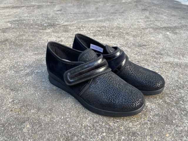 Ontdek deze zwarte pantoffel met velcro, perfect voor moeilijke voeten. Het uitneembare voetbed biedt ruimte voor orthopedische zolen, terwijl de stevige zool zorgt voor grip en stabiliteit!