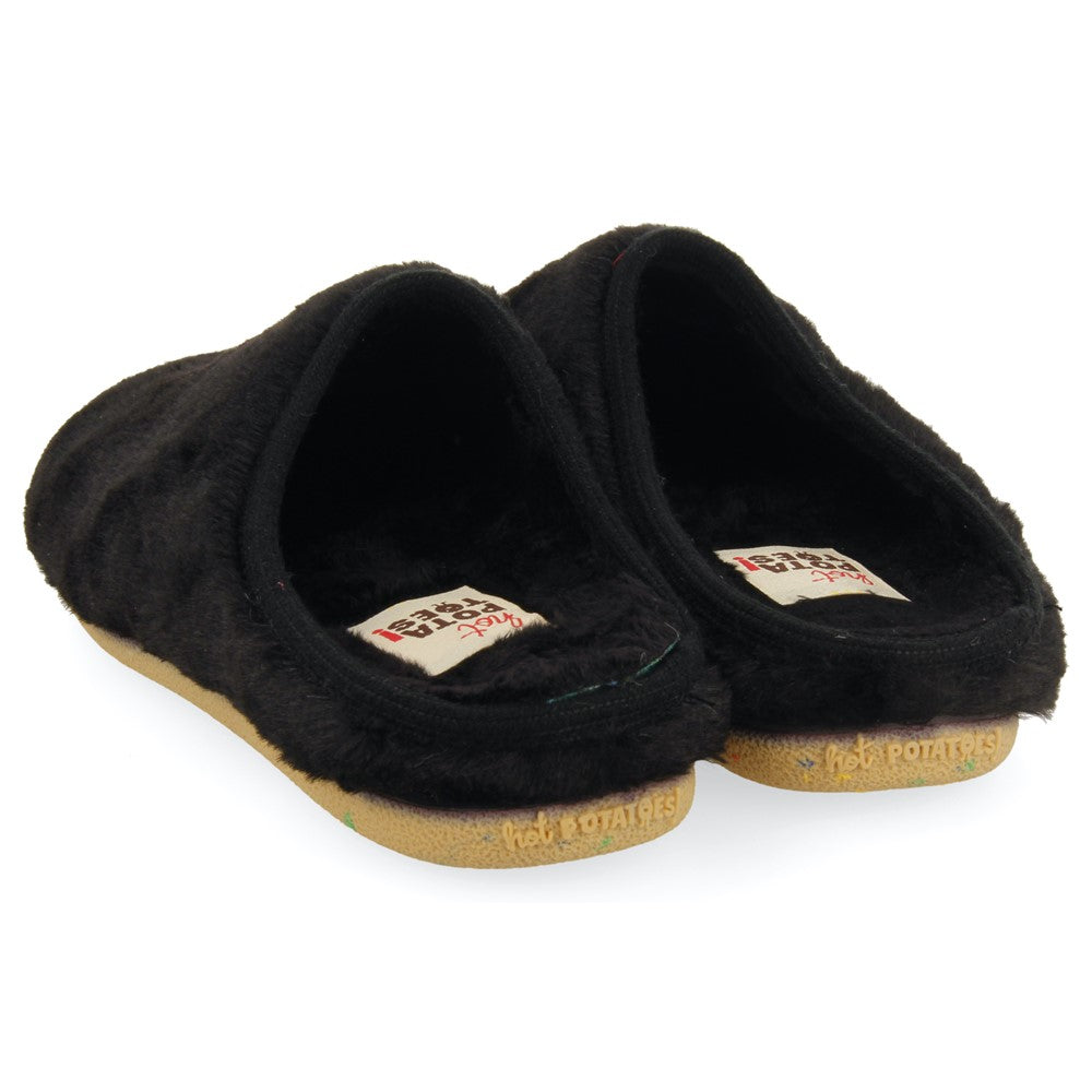 Hot Potatoes pantoffel voor dames met furry look. Comfortabel en Made in Spain. Vervaardigd van polyester en de zool is van natuurlijk rubber met gerecyclede kunststof snippers. Uitneembaar voetbed.